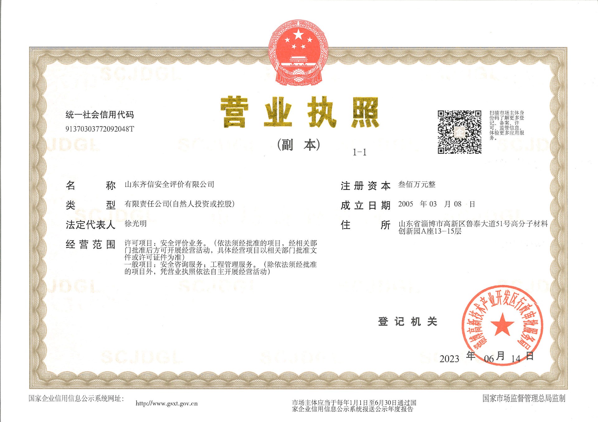 山東齊信安全評價有限公司成立于2005年3月,注冊資本300萬元人民幣,固定資產總值804.8728萬元。法定代表人徐光明,注冊地址及辦公地址位于淄博高新區魯泰大道51號高分子材料創新園A座13-15樓。2005年9月取得安全評價機構乙級資質。自國家應急部1號令實施以來,公司于2020年1月15日取得新安全評價資質,業務范圍包括:陸上油氣管道運輸業;石油加工業,化學原料、化學品及醫藥制造業;金屬冶煉。2018年12月21日取得安全生產標準化二級評審單位,評審范圍:危險化學品、紡織、建材、輕工、冶金、機械。 公司現有人員41人,其中專職安全評價師37人,注冊安全工程師26人,研究員1人、碩士5人、雙學士1人,山東省安全專家庫專家1人、教授級高工1人,高級工程師8人、工程師22人,專職危險化學品標準化評審員、工商貿標準化評審員30人,本科以上學